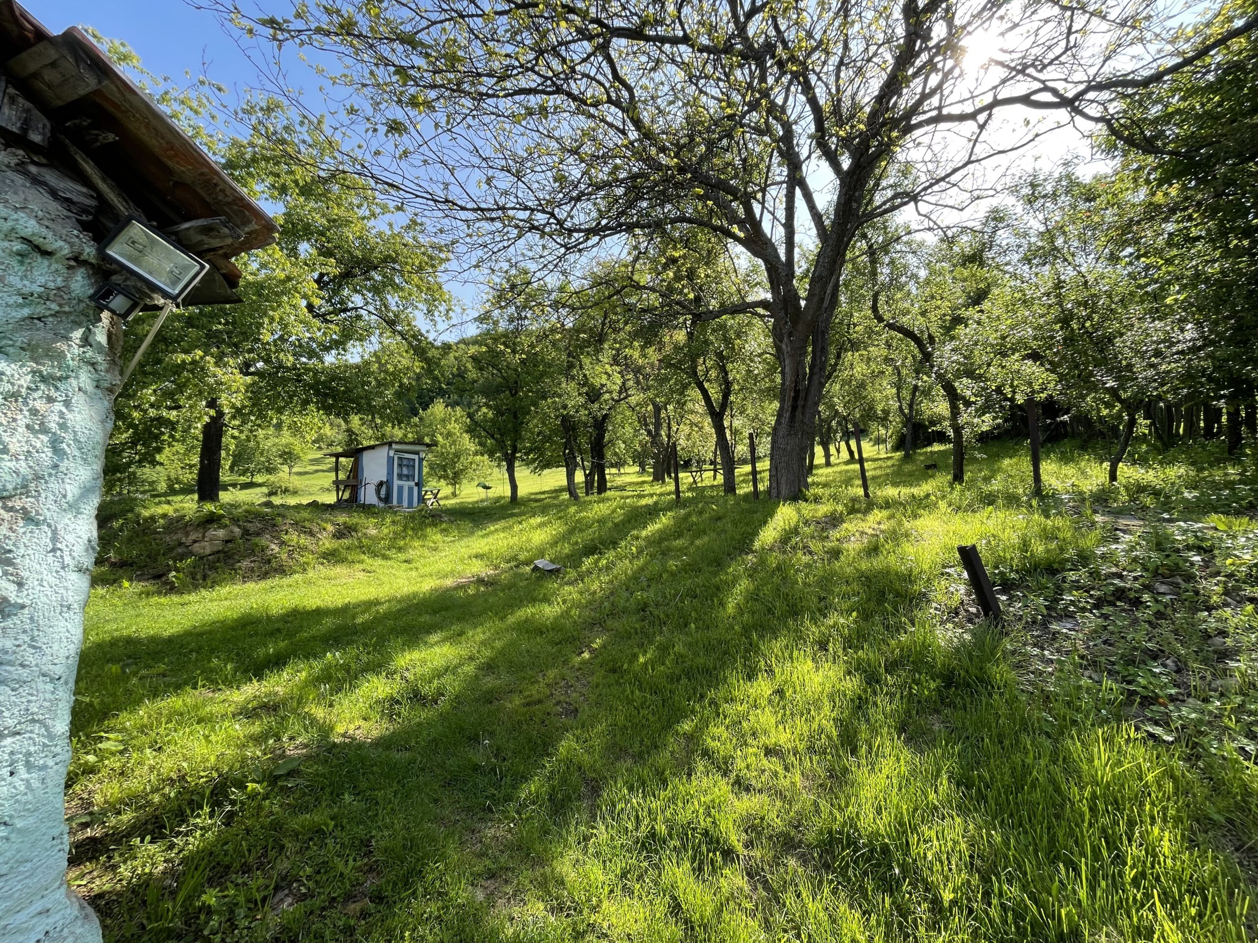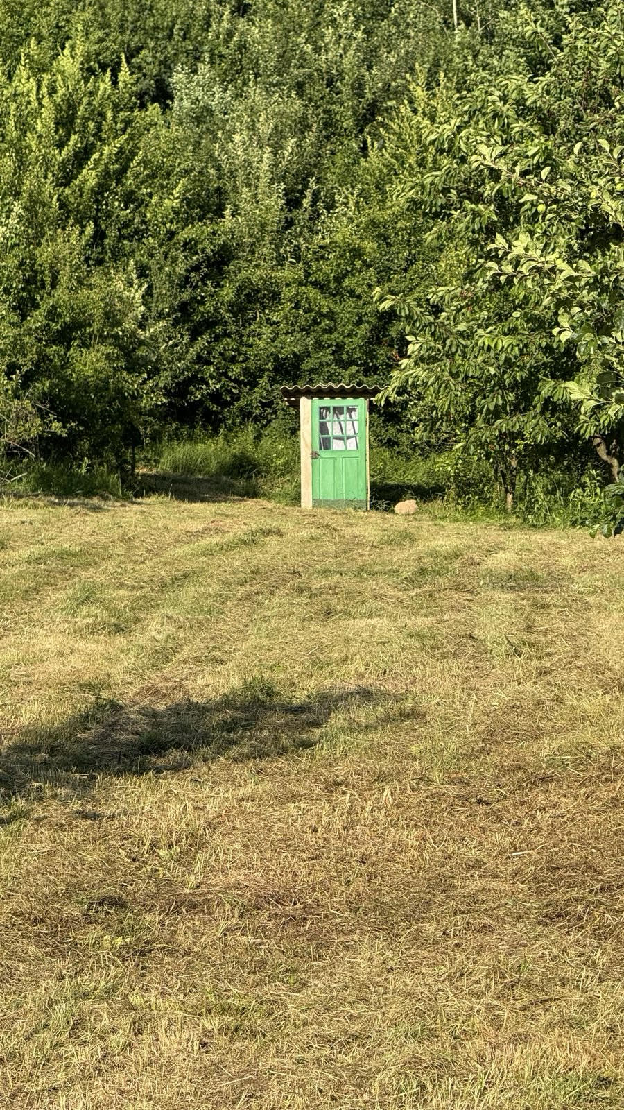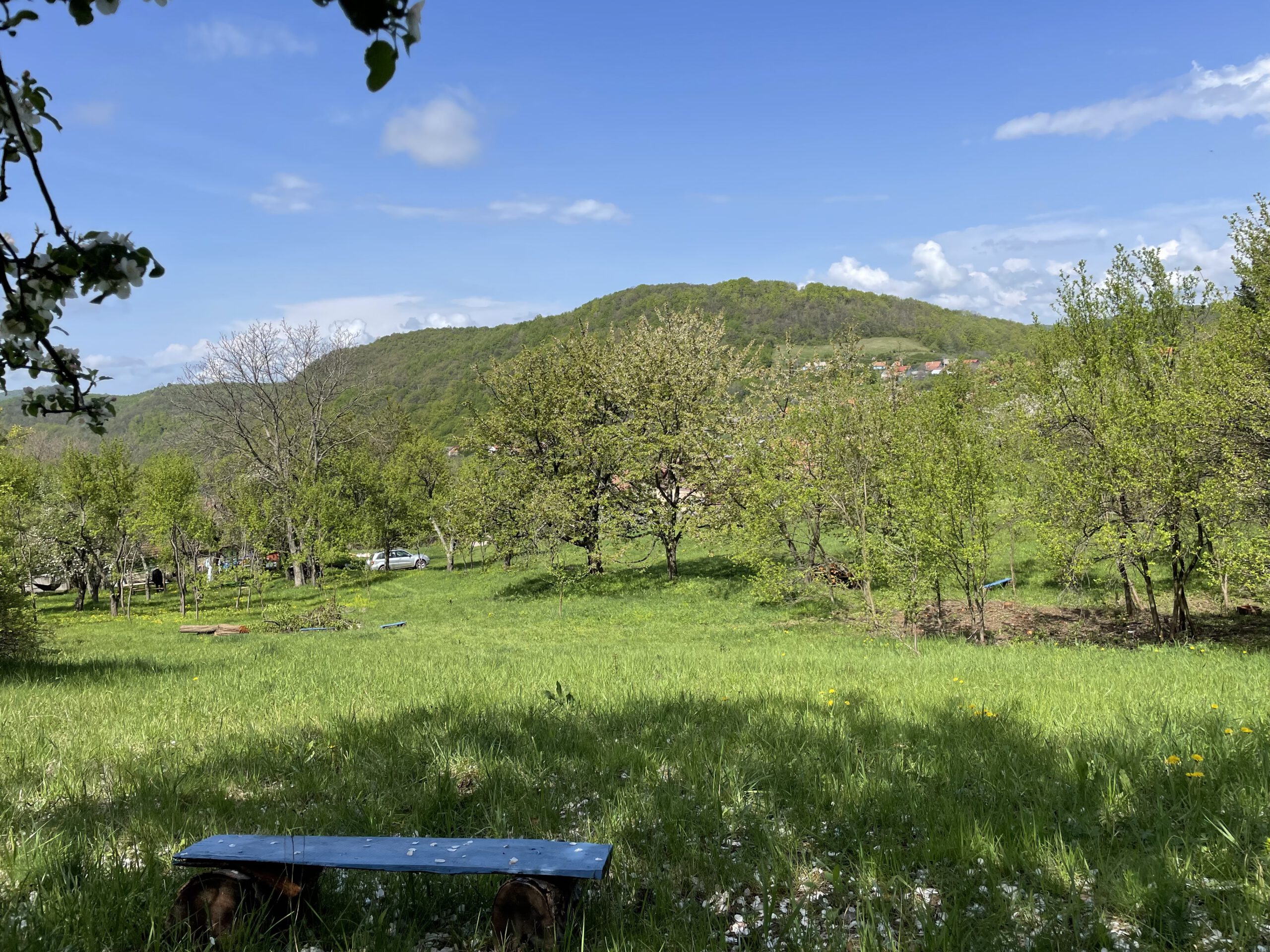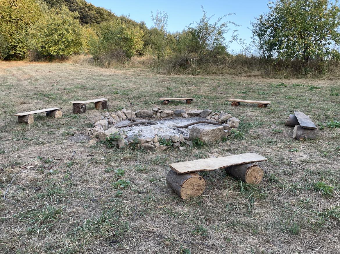 🏕️ Velká zahrada za Domečkem, částečně pokrytá stromy, s pitnou vodou, ohništěm a suchým WC. Ano, takový ten typický zážitek – ale s možností mít i výhled.