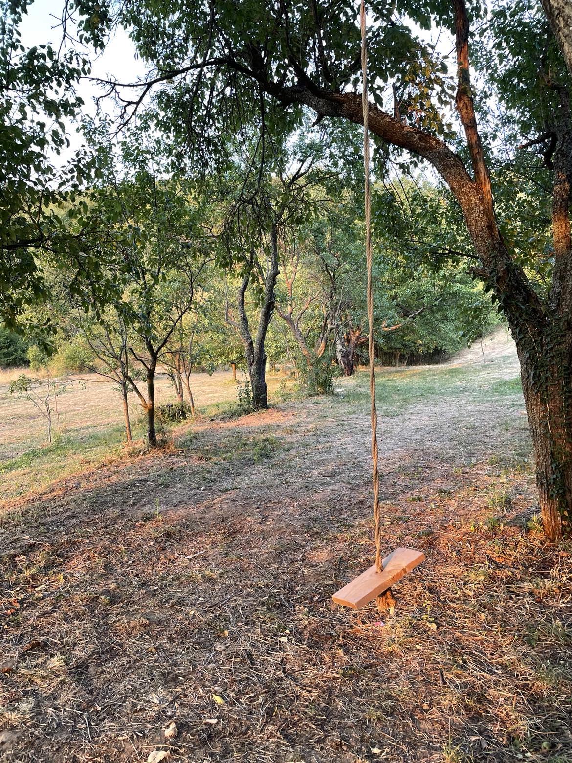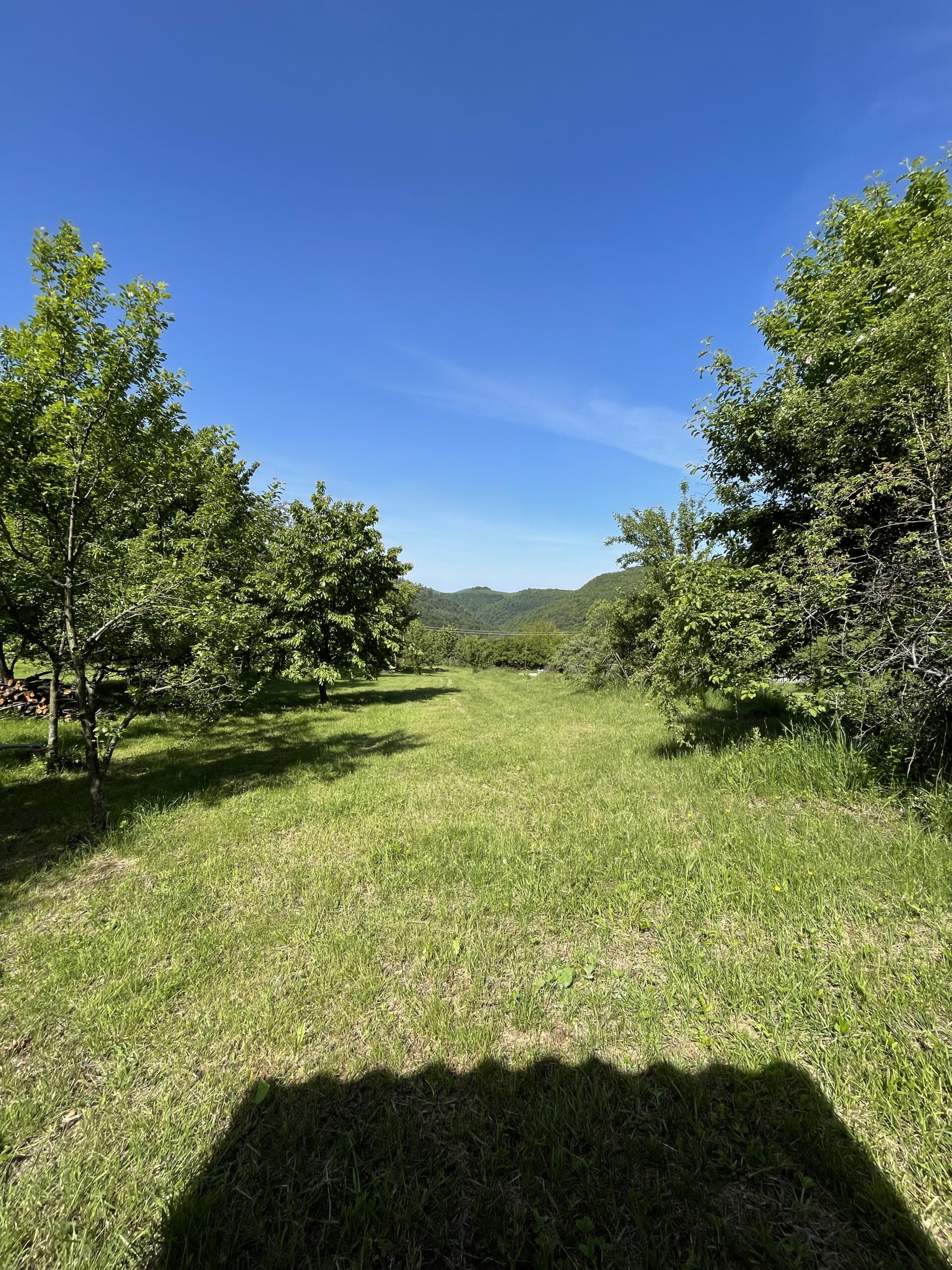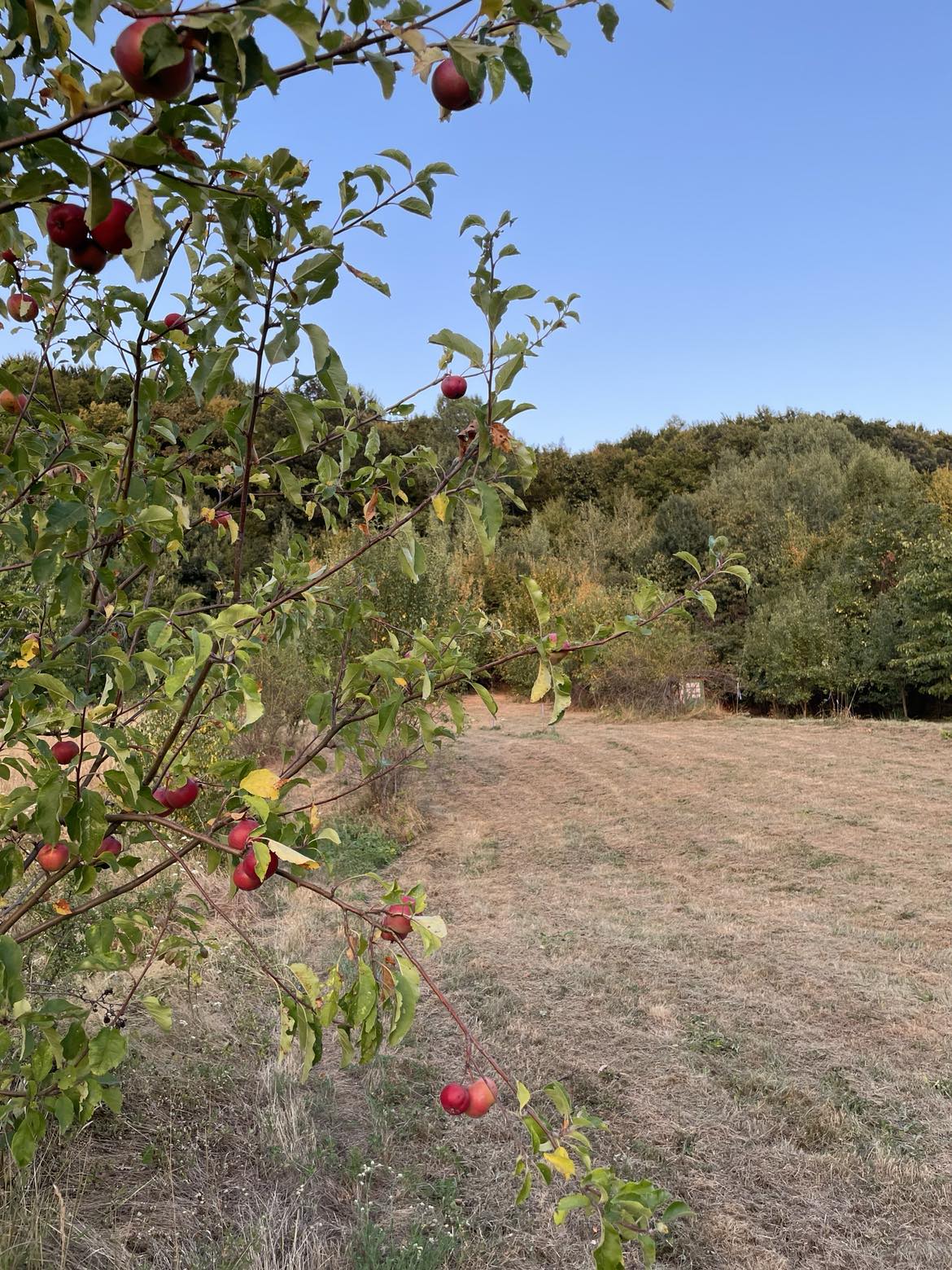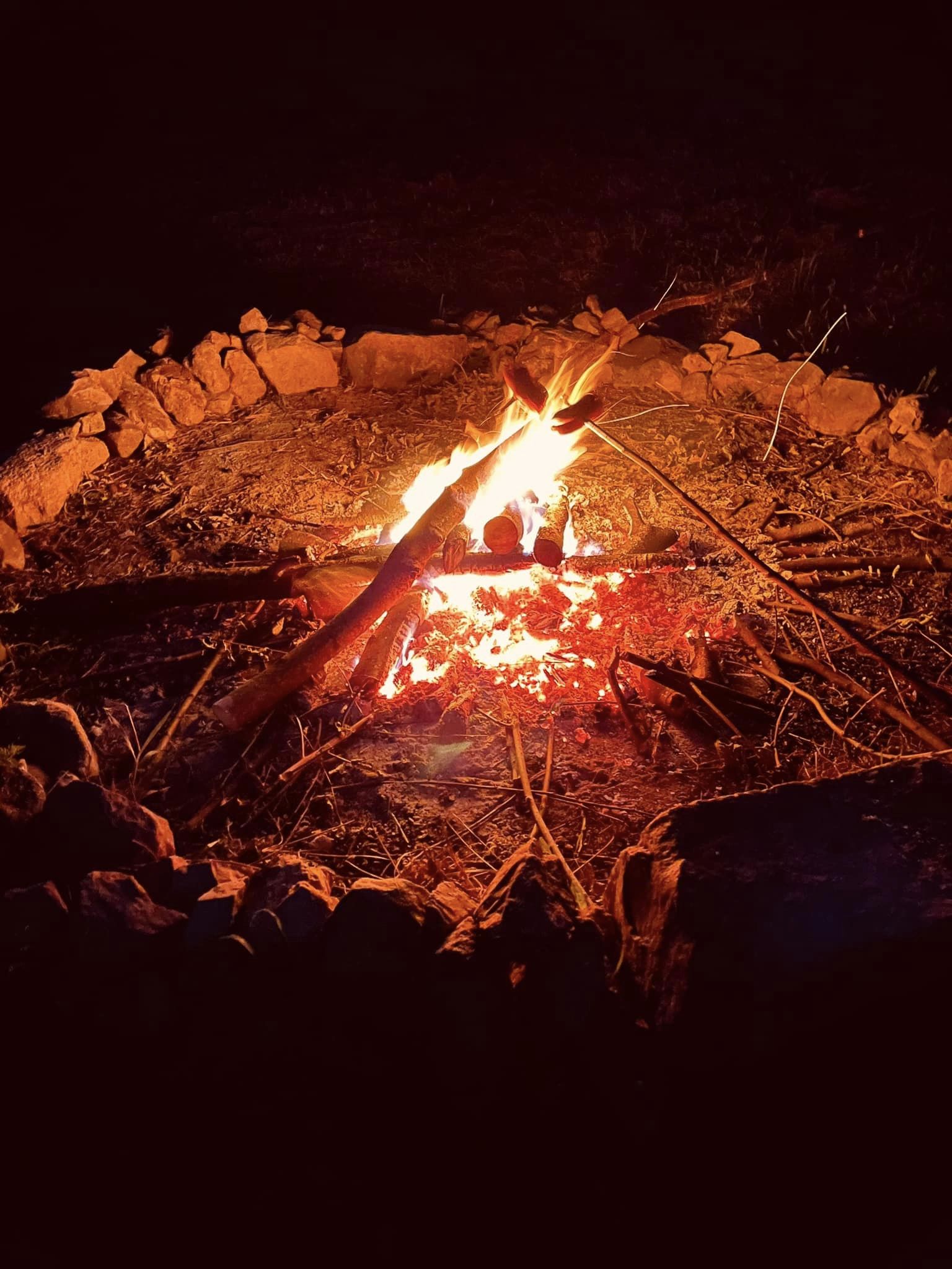 🏕️ Velká zahrada za Domečkem, částečně pokrytá stromy, s pitnou vodou, ohništěm a suchým WC. Ano, takový ten typický zážitek – ale s možností mít i výhled.
